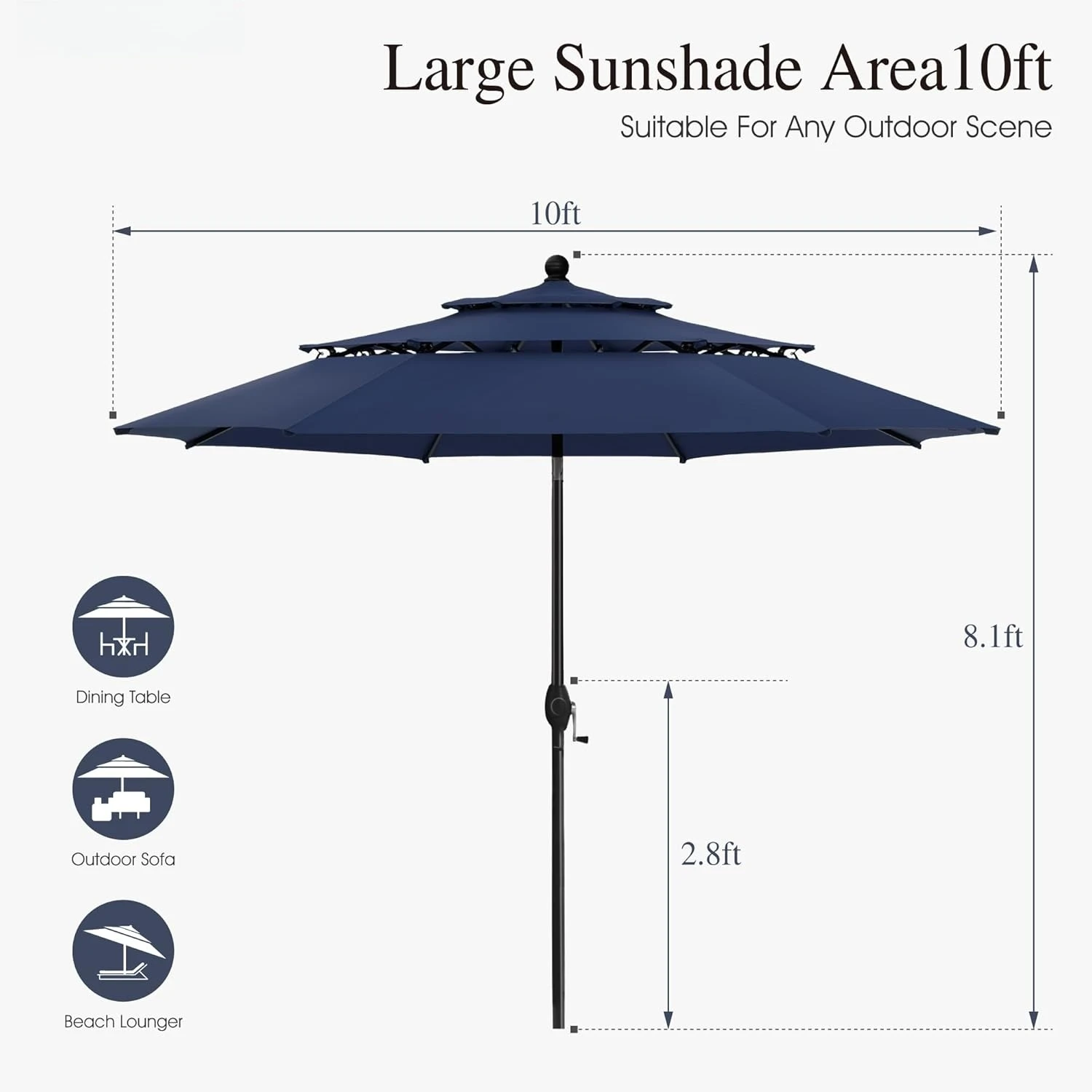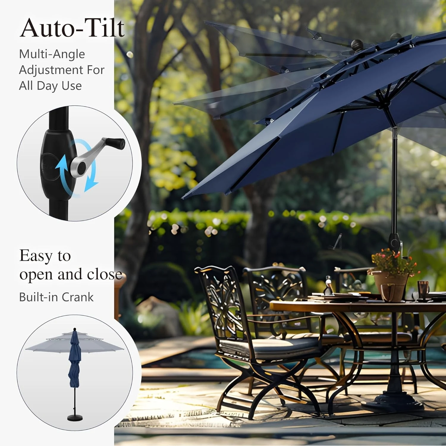 The auto-tilt feature allows you to easily adjust the angle of the umbrella as the sun moves, ensuring consistent shade throughout the day. A smooth crank handle system makes opening and closing the umbrella quick and effortless. The large 10-foot canopy provides generous coverage for outdoor dining tables, seating areas, or relaxing lounge spaces.