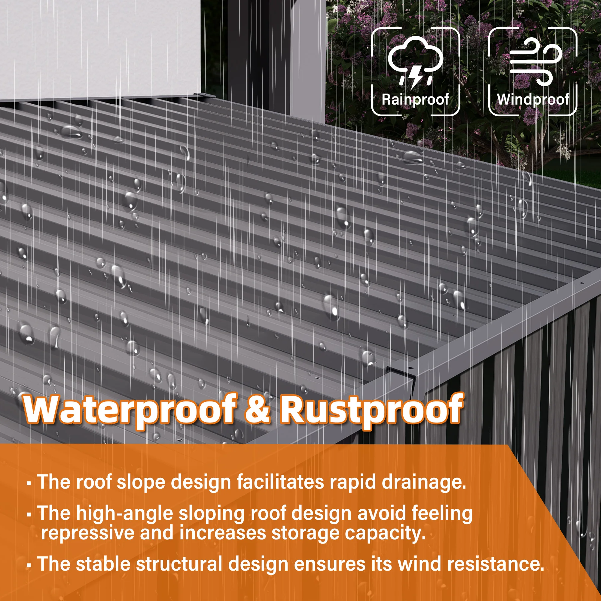 Built with sturdy, weather-resistant metal panels, this shed is made to withstand rain, sun, and seasonal changes. The sloping roof design helps prevent water buildup while promoting efficient drainage to protect your belongings.