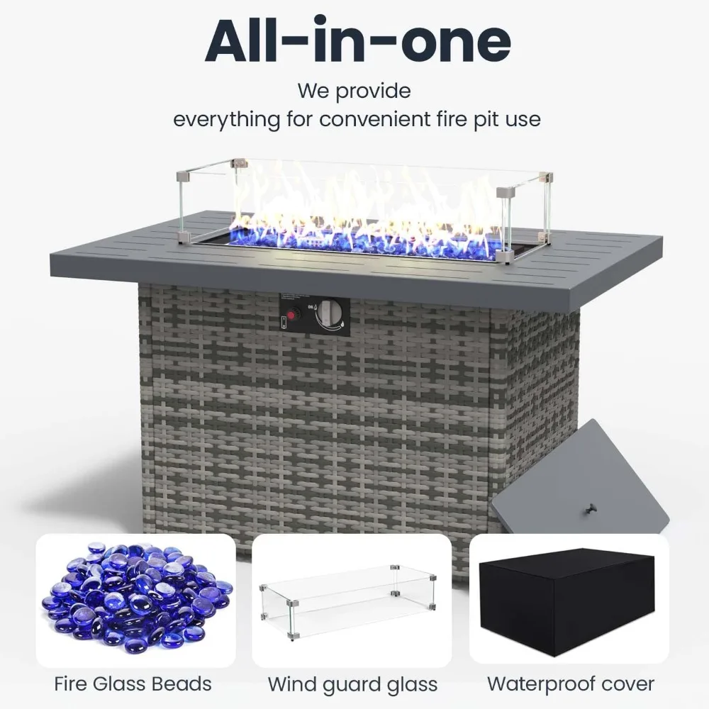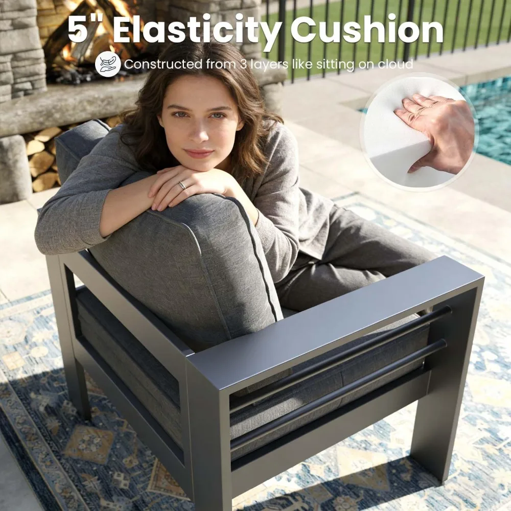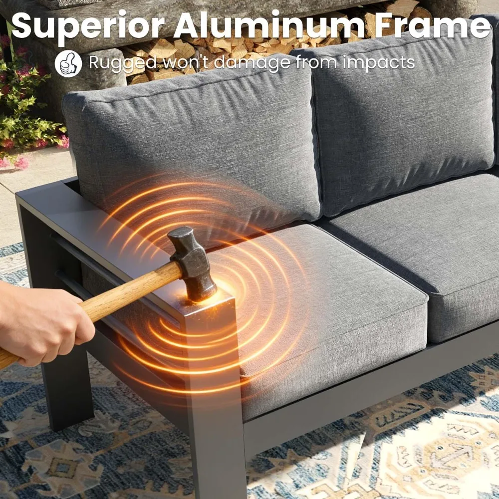 Create a warm and inviting outdoor retreat with this 5-piece modern aluminum patio furniture set. Designed with a durable metal frame, this sectional sofa offers long-lasting strength and weather resistance for year-round enjoyment. The included fire pit table adds both ambiance and functionality, making it perfect for cool evenings and outdoor gatherings.