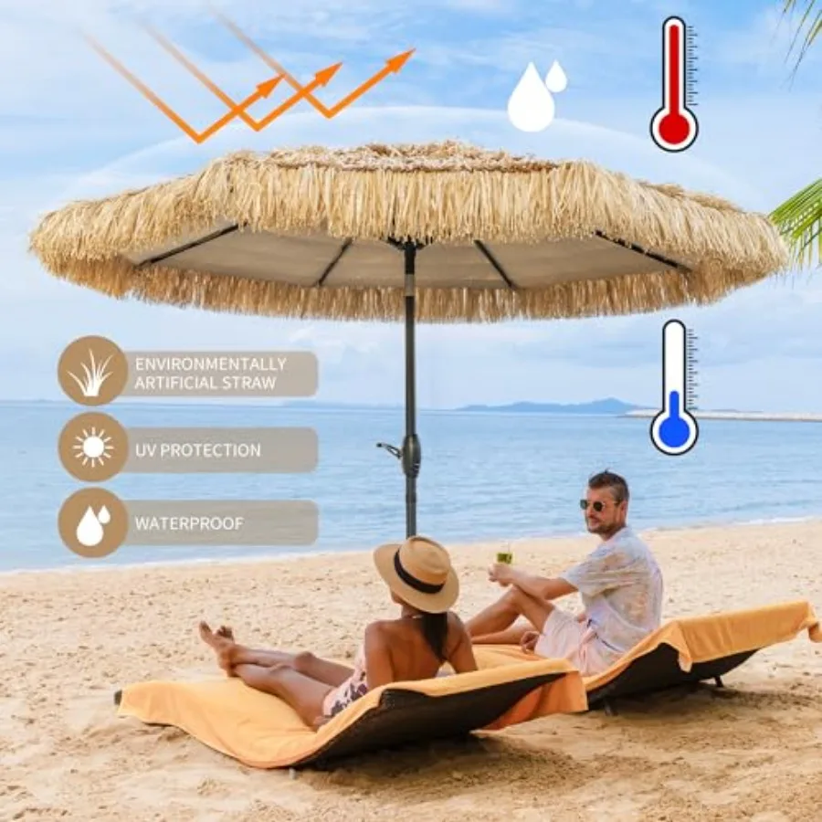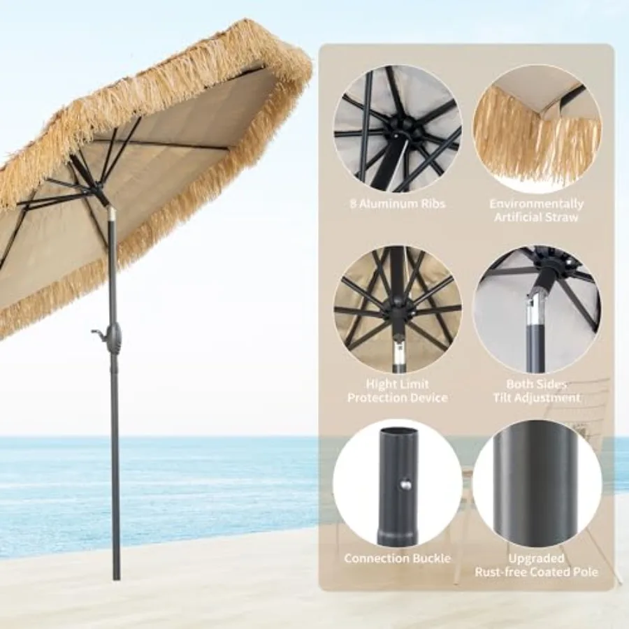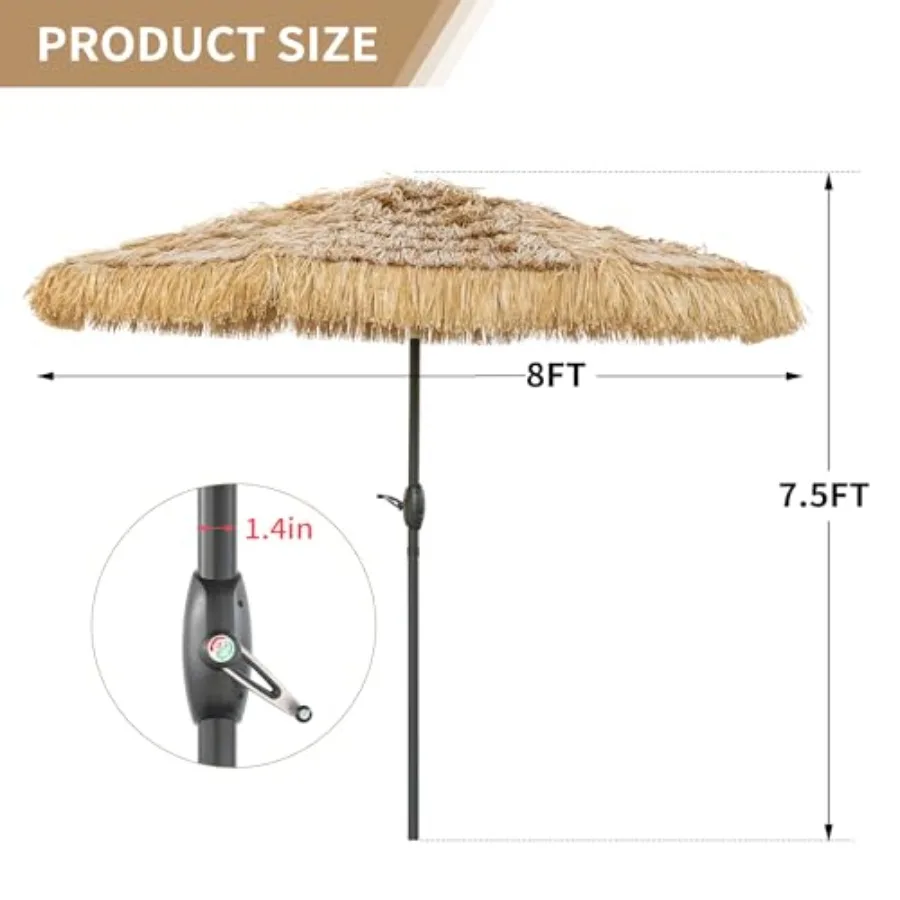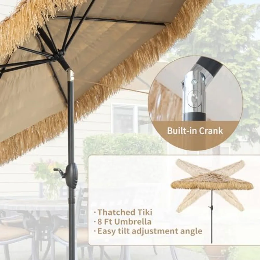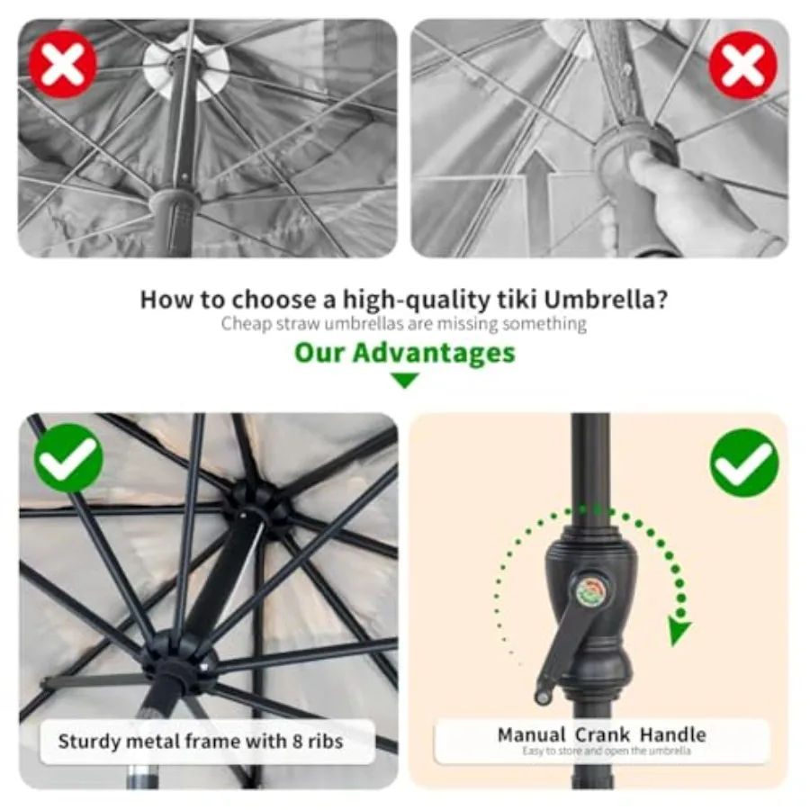 Bring a tropical vibe to your outdoor space with this 8FT tiki patio umbrella designed for style and shade. The thatched canopy creates a relaxed island inspired look perfect for patios, beaches, or poolside areas. Built with UPF 50 plus protection, it helps shield you from harmful sun exposure. The durable construction ensures long lasting use in various outdoor conditions. Its sturdy frame provides reliable support and stability during use. Ideal for backyard gatherings, beach days, or outdoor lounging, it adds both function and flair. The lightweight design makes it easy to set up and reposition as needed. Designed for comfort, it creates a cool and shaded area for relaxing outdoors. The stylish tropical design enhances any outdoor decor setting. Upgrade your outdoor experience with a tiki umbrella that combines protection, durability, and eye catching style.